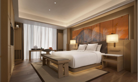 客房在室內(nèi)空間使用元素基礎(chǔ)上,提取蘇州具有代表性的景色縮影,結(jié)合“中國紅、東方紫、如意金”來傳達時代新風(fēng)下的國際都市。